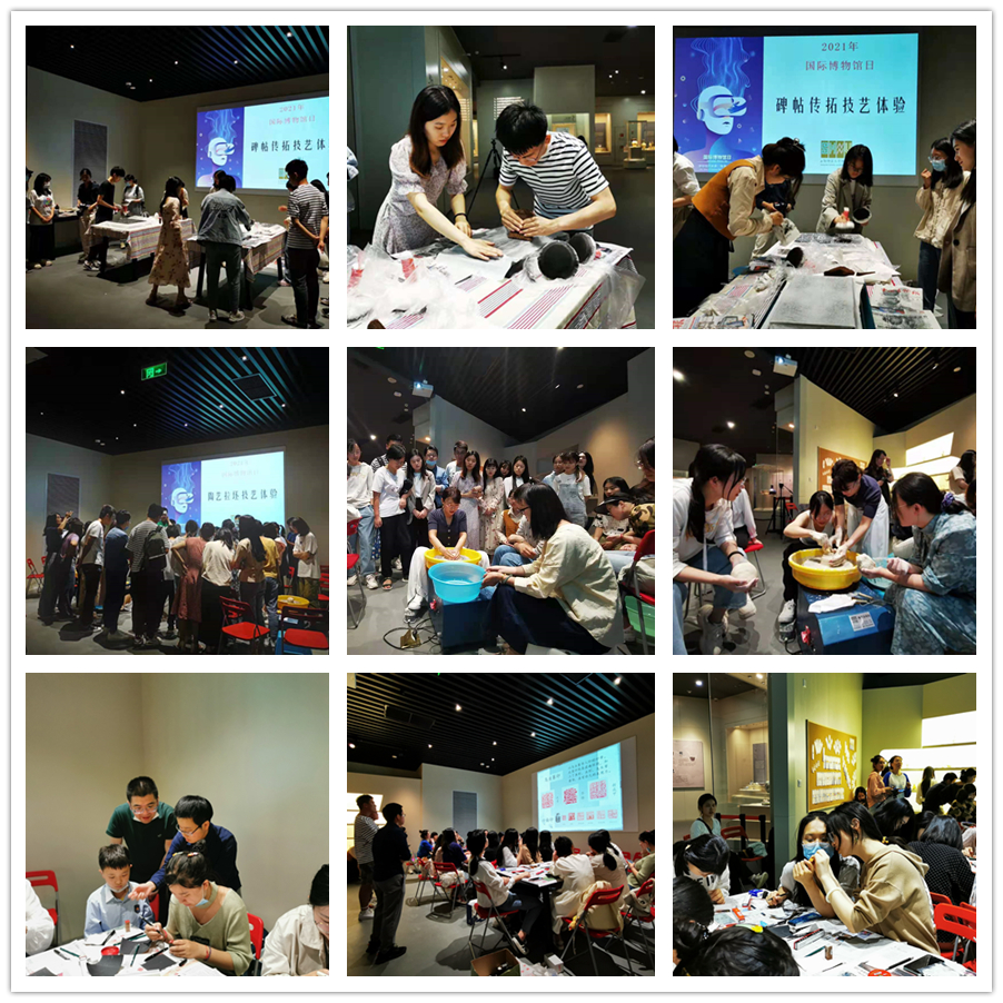 碑帖传拓体验项目中,根据馆藏书画珍品精心定制的石碑吸引观众体验“备纸”、“上纸”、“上墨拓印”、“揭纸”等碑拓全过程,在细细敲击、打磨后,黑白相间,浓淡相宜的拓片作品跃然石上;下午的陶艺体验活动人气爆棚,从校外专门聘请的陶艺专家为观众带来了传统陶艺拉坯技巧讲座,师生在其指导下用传统拉坯机为自己定制专属的陶艺作品;晚上的传统篆刻体验活动更是将全天活动推向高潮,来自不同学院的师生和教职工子女早早地将体验区位置坐满。观众在指导老师的指导下为自己刻画了一枚带有“5·18国际博物馆日”印记的印章。