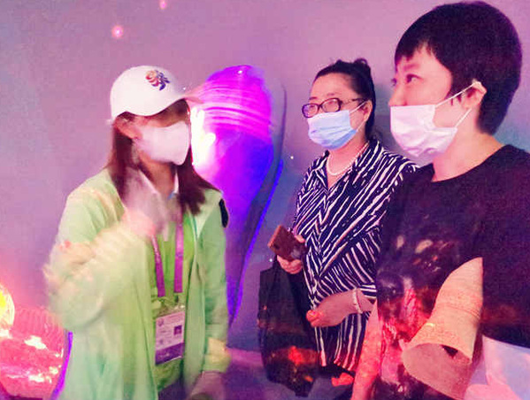 庄越然说,她在引导客流的时候也注意到,因为场馆里有全息投影,场馆里全都是黑的,因此,也有些小观众会有点害怕,她就尝试着主动告诉小观众这里的神奇和美丽。后来,就越来越喜欢在不影响引导工作的情况下“跨界”介绍场馆了。