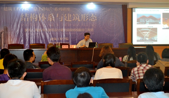 周健总工程师用通俗易懂的语言献上了一场精彩的讲座,原本深奥复杂的知识点在他的讲解下变得更易理解,周健总工从建筑师与结构工程师的合作及大跨建筑基本结构体系及建筑效果两方面入手,阐述了结构体系与建筑结构的紧密联系。他列举了许多当今著名建筑物的实例,通过分析建筑的外观与其内部结构的关系,让大家更好地理解讲座的主题。他根据自己多年来丰富的工作经验,把建筑效果与大跨建筑结构的结合给大家做了生动、详尽的介绍。下午三点,在老师和同学们热烈的掌声中讲座圆满结束。