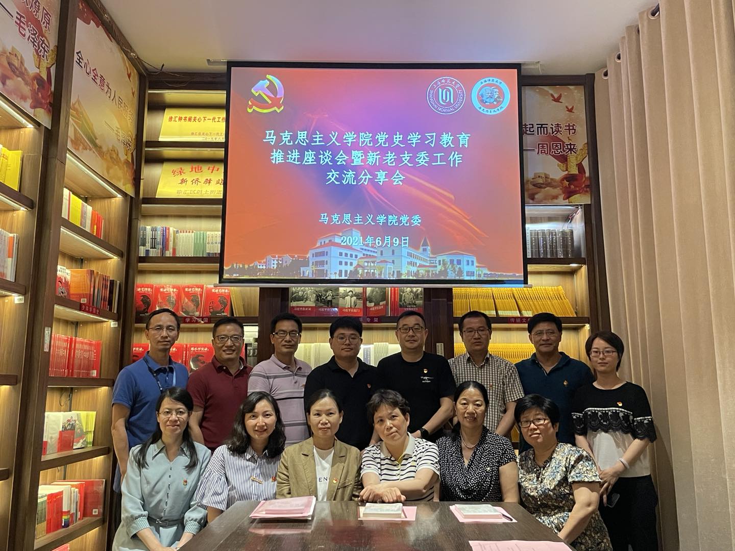 6月9日下午,马克思主义学院党委在钟书阁召开党史学习教育推进座谈会暨新老支委工作交流分享会,学院党委委员、教工支部书记和支委参加。