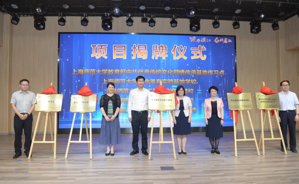 上海师范大学教育学院书记徐晓明、影视传媒学院院长赵炳翔、信息与机电工程学院院长张波、上海市教育委员会基础教育处副处长陆黎英、杨浦区教育工作党委书记叶靖、杨浦区教育局局长卜健共同为5个合作项目揭牌