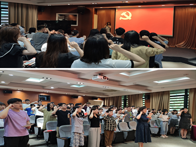 之后老师们向全体毕业生党员赠送了政治生日纪念卡,卡片上清晰记录着每位同志的入党时间,并印有文字版入党誓词和高祥荣老师宣读的有声版入党誓词二维码。随后,由杨康贤书记领誓,全体党员同志面向党旗,高举右拳庄严宣誓,回顾了自己对党忠诚的誓言。