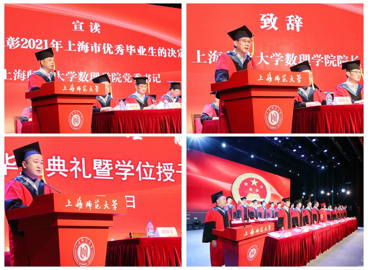 典礼暖场环节播放了由毕业生自导自演的毕业季视频《不说再见》,师生共同回顾了在师大奋进的岁月和青春。毕业典礼在慷慨激昂的国歌声中拉开序幕。数理学院院长石旺舟教授代表学院全体教职工向在座毕业生们圆满完成学业表示热烈的祝贺,并为同学们送上最衷心的祝福和寄语。他希望所有即将走出校门的新一届“师大人”们,始终秉持“厚德、博学、求是、笃行”的师大校训,努力成为立大志、明大德、成大才、担大任的时代新人,以优异成绩献礼党的百年华诞。数理学院党委书记樊连生宣读了关于表彰2021年优秀毕业生的决定,校长袁雯、学院全体党政班子成员分别为市级和校级优秀毕业生颁发荣誉证书。