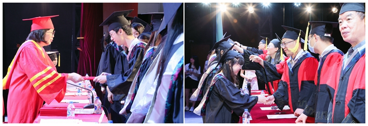 随后,校长袁雯和主席台所有老师为获得学士学位、硕士学位和博士学位的毕业生们逐一正冠拨穗、授予学位。仪式结束后,同学们感谢老师们的精心培育和谆谆教诲,纷纷向恩师献花。