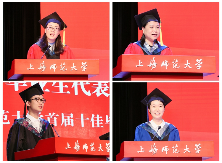 我校首届十佳毕业生费逸航同学和上海市优秀毕业生郭文雨同学分别代表本研毕业生发言。他们回忆了自己美好的大学时光,表达了对学校、学院、老师、同窗的感激之情。生逢盛世,同学们始终会铭记师大赋予的使命和力量,在拥抱时代和扎根祖国中创造出更加饱满、昂扬、无悔的人生华章。