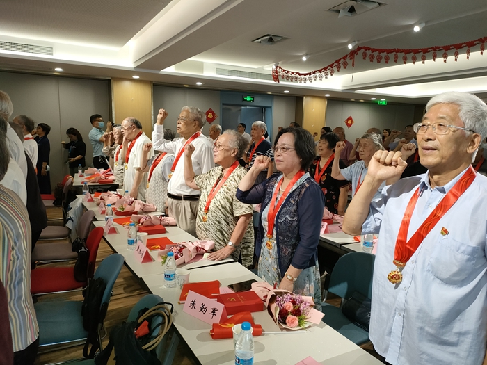 6月17日,为迎接建党百年,学校组织召开了“光荣在党50年”党员表彰大会活动,哲法学院获得“光荣在党50年”纪念章的孙育玮、朱勤军、黄冰清、夏乃儒、傅珍芬和谭玉林等6位老党员、学院党委书记贺朝霞、学院党委组织员翁娜、新发展学生党员代表吴梦凡等参与此次活动。在颁奖仪式上,全体党员一起重温入党誓词,表彰活动在《不忘初心》的歌声中圆满结束。
