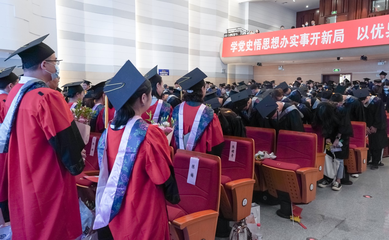 全体毕业生身着学位服入场完毕。老师与毕业生们全体起立,在庄严而嘹亮的国歌声中,毕业典礼拉开序幕。