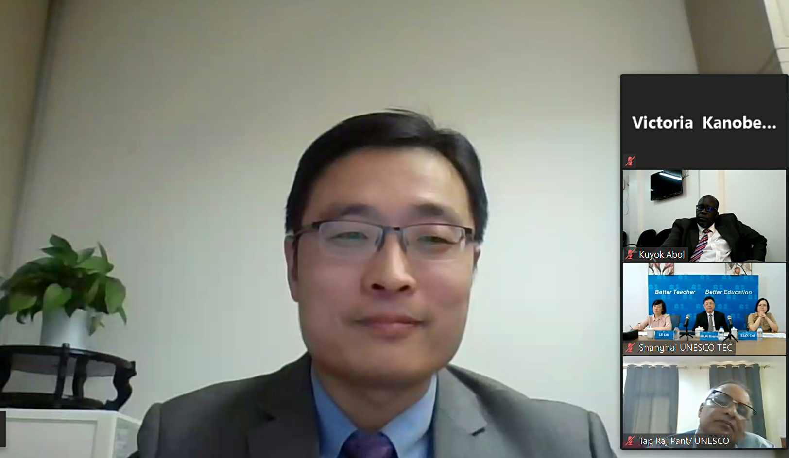 会议由UNESCO教师发展处处长Carlos Vargas Tamez主持。上海市教委国际交流处处长吴英俊、副处长芦琍琍代表上海市政府出席,张民选教授和卞翠副研究员代表UNESCO TEC参加了此次会议。出席会议的还包括UNESCO IICBA主任Yumiko Yokozeki女士及该所另外2位高级项目官员,UNESCO亚太局教育创新和技能发展科负责人汪利兵及该局教师发展科官员Natalie Hong, UNESCO西非地区办事处主任、内罗毕办公室主任,以及参与国代表塞拉利昂教育部部长David Monina Sengeh及南苏丹普通教育和教学部副部长Abol Kuok。