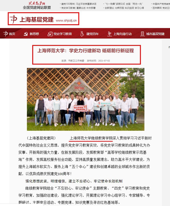 学校开展党史学习教育以来,继续教育学院党总支坚持立德树人根本任务,为党育人,为国育才,发挥高质量党建引领作用,开展教师教育特色的继续教育人才培养和社会服务,推动继续教育高质量发展,助力学校高水平大学建设。上海基层党建网、上海教育新闻网和东方网等媒体在建党百年之际,多次进行专题报道。