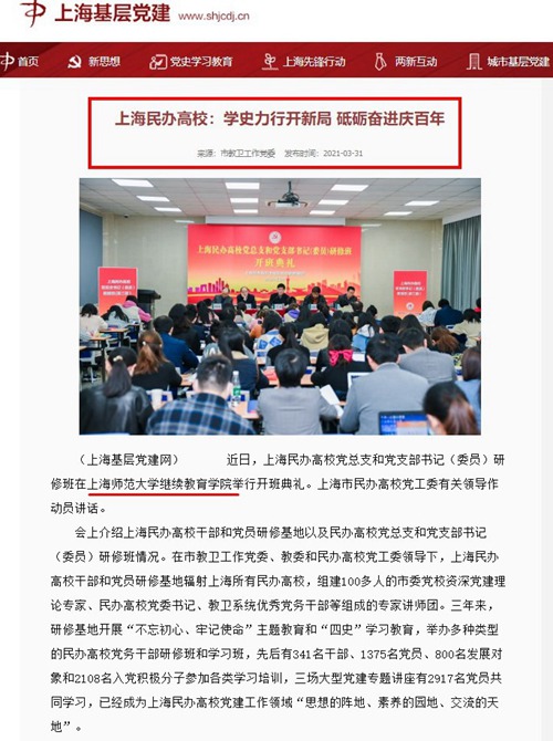 3月31日,上海基层党建网以“头条新闻”形式,专题报道继续教育学院为上海民办高校举办第三期党总支和党支部书记(委员)研修班,开展党史学习教育。