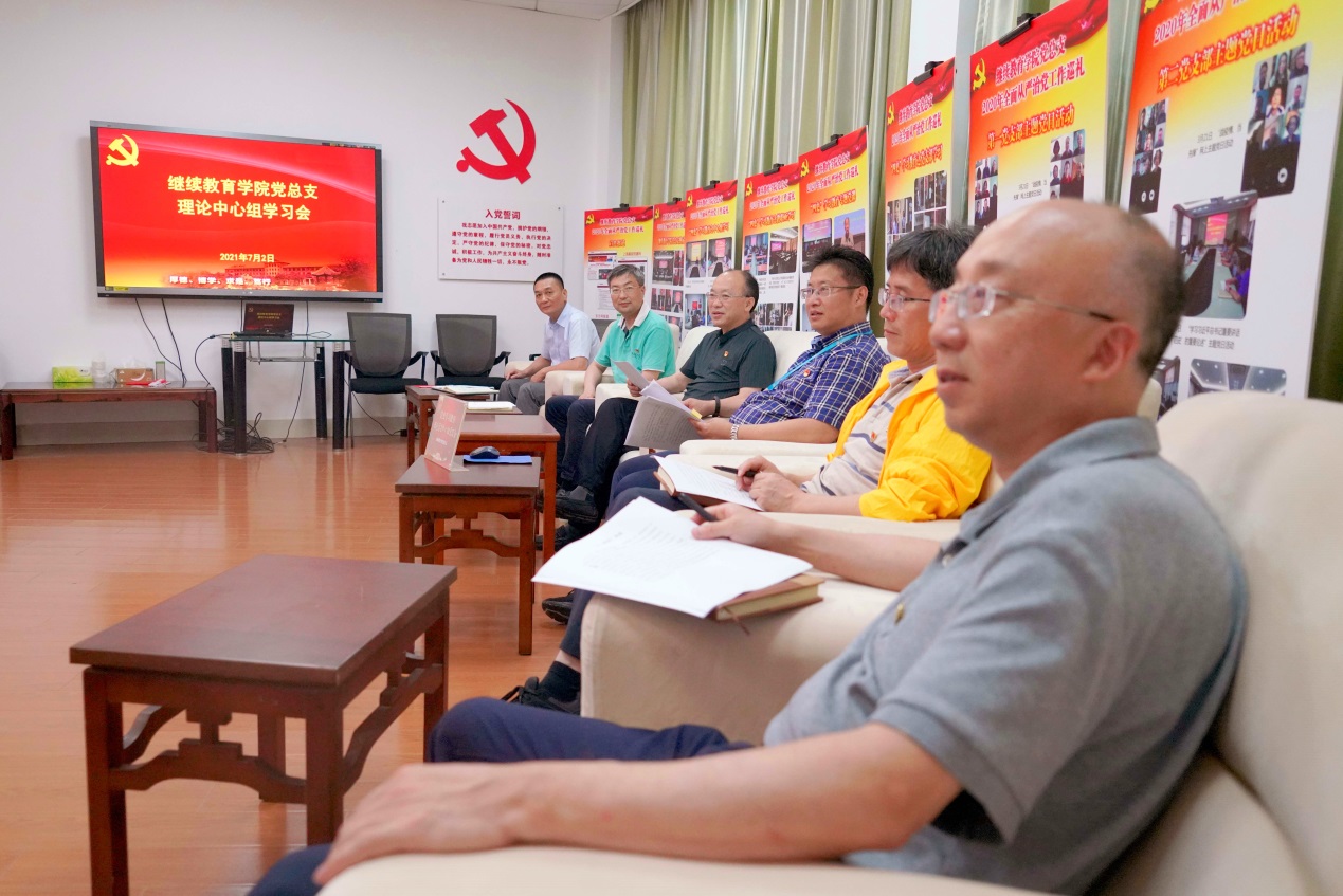 7月2日下午,继续教育学院党总支理论学习中心组在学院105会议室举行党史学习教育第七次专题学习会,围绕“习近平总书记在中国共产党成立100周年庆祝大会上的重要讲话”专题,进行了学习和研讨。