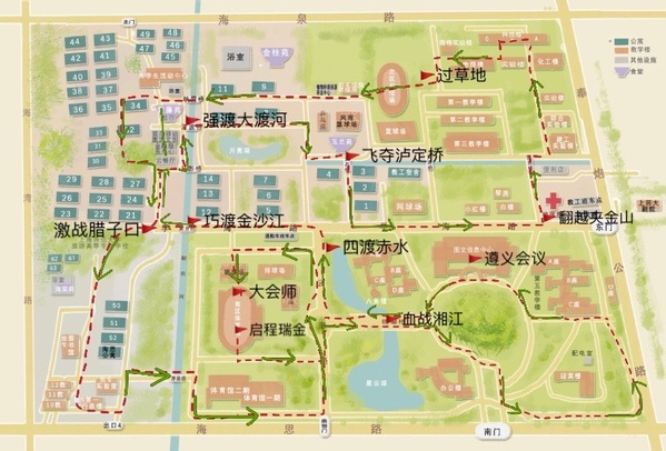 了解,上海师范大学此次军训拉练,从坐标学校南部操场的“瑞金”启程,模拟重走红军二万五千里长征中具有重要意义的11个节点:金沙江、大渡河、泸定桥、夹金山……“一切向前走,都不能忘记走过的路。”学生依次经过这些书本中熟悉的“地点”,喊着响亮的口号,迈着整齐的步伐,在中国共产党成立100周年之际深刻感悟伟大的长征精神。
