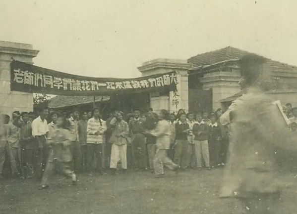 1952年9月,华东师大师生热烈欢迎院系调整后前来报到的圣约翰大学、沪江大学、浙江大学等校师生。