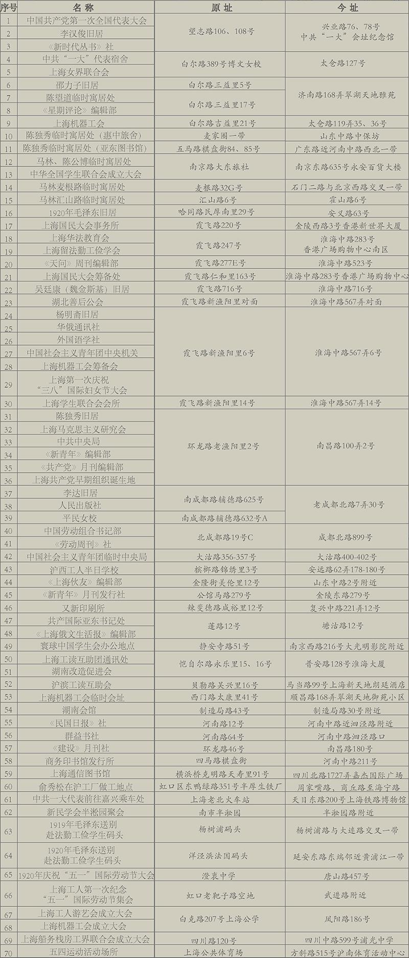 据了解,《中共上海建党革命遗址分布图》由教育部重点研究基地上海师范大学都市文化研究中心苏智良团队研制而成。70个地点中,不仅包括公众熟知的中共“一大”会址、中国社会主义青年团中央机关、《新青年》编辑部等地点,还包括一批五四运动组织机构与活动场所、中共“一大”代表及相关人物旧居、中共领导组织的工会以及宣传教育机构等,几乎涵盖了1919年至1921年中共在上海建党各方面的活动轨迹。