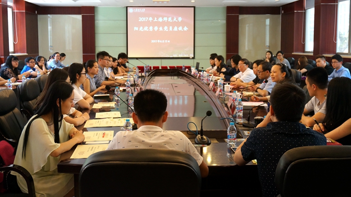 为树立典型,表彰先进,6月15日中午,学校在外宾楼101会议室召开“阳光优秀学生党员”座谈会,表彰“阳光优秀学生党员”。原上海师范大学校长杨德广教授、“阳光优秀学生党员”奖学金出资方代表严晓飞、校党委组织部部长曹诚、组织部副部长曹鹏、校办副主任陈晓虹、学工部副部长孙雅艳、研工部副部长杨龙波及60名“阳光优秀学生党员”出席座谈会。