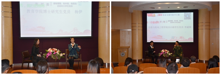 正是基于调研数据的分析,10月24日结业式前,党校举行“做有理想、有担当、有作为的青年大学生党员”面对面交流活动。马克思主义学院全体学员以闪读形式,朗诵了不同年代的青年共产党员关于理想和担当的名言警句。接着,谢晋影视艺术学院和人文与传播学院两位学员访谈了2018年“中国电信奖学金·天翼奖”暨“践行社会主义核心价值观先进个人标兵”称号获得者、信息与机电工程学院学生党员李威锋,校第七次党代会代表、教育学院博士生党员杨伊。两位优秀学生党员从如何净化入党动机、如何坚定理想信念、如何提升个人能力素养、如何提升专业学习水平等方面与现场全体学员作了热烈的互动和交流。