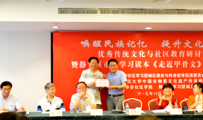 6月15日,由上海市静安区学习型城区建设与终身教育促进委员会办公室与我校非遗传承研究中心联合举办的市民读本《走近甲骨文》发布会在市政协会议室召开。校非遗传承研究中心主任陆建非与上海市教委终身教育处副处长夏瑛、上海市学习型社会建设指导中心主任彭海虹、静安区学习型城区建设与终身教育促进委员会办公室副主任周晓春、静安区社区学院副院长闵楠出席发布会。