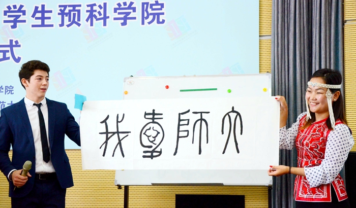 今年的结业仪式全部由预科学院的同学们策划和组织。结业仪式从汇报演出开始。来自蒙古的土木金同学一曲《我的歌声里》,深情款款,表达了对同学们依依惜别之情;来自卢旺达的叶先和来自越南的黄玉玄为大家带来诗朗诵《中国话》,字正腔圆,表达了他们对汉语的热爱。而来自俄罗斯的玛丽娅和来自蒙古的乌尔吉则为大家带来了书法作品《我爱师大》。哈萨克斯坦学生艾理为大家带来演讲《汉语情、中国梦:我与一带一路》,讲述他汉语学习的经历以及对中国一带一路战略的理解。最后,同样来自哈萨克斯坦的乌米特以一首粤语版的《喜欢你》将演出活动推向高潮。