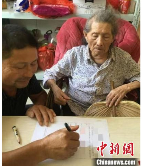 103岁的年珍奶奶望着自己的侄子帮她签收条。她以不屈面对风雨,用自强写就人生。 中国“慰安妇”问题研究中心供图