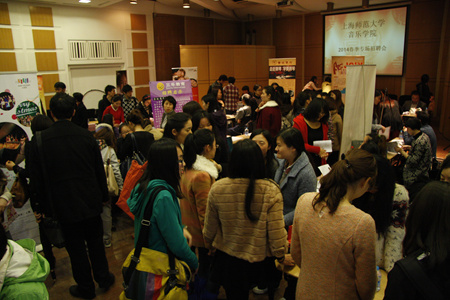 音乐专场招聘会邀请上海音卓钢琴艺术中心、青岛小小莫扎特音乐有限公司、上海儿童艺术进修学校、东方舞韵艺术学校、三乐文化艺术学校、上海悦童汇教育信息咨询有限公司、上海隆霆文化传播有限公司、星友传媒、星空琴行、牧野音乐等近二十家用人单位前来招聘。近两百名音乐专业毕业生以及大三学生前来参加,他们纷纷有秩序地投递简历,认真地与用人单位洽谈,为自己争取就业或者实习的机会。招聘现场气氛热烈,部分学生通过现场面试初步达成了就业意向。
