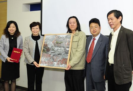 美术学院校友会第一届理事会会长、美术学院执行院长刘旭光教授向大家介绍了美术学院近几年的建设与发展情况并汇报了第一届理事会的工作设想。上海市美术家协会副主席张培成先生、上海商学院外语学院党总支副书记王韦达女士及华东政法大学渊帅先生在会议中发言,表达了对学校和学院深厚的情感,并表示愿尽其所能为学校建设出力。2014届毕业生冯祥云同学将自己创作的国画《隔水听笙簧》捐赠给学校,柯勤飞代表学校接收捐赠并为其颁发了证书。