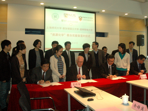 按照教育部最新发布《国际合作联合实验室计划》的通知(教技[2014]1号)要求,依托“资源化学”教育部重点实验室,上海师范大学、美国普林斯顿大学、新加坡国立大学及其苏州研究院等四方共同成立的“资源化学”国际联合实验室4月17日在我校举行签约仪式。副校长柯勤飞教授主持仪式,副校长刘晓敏教授、新加坡国立大学常务副校长Tan Eng Chye教授、普林斯顿大学Steven Lynn Bernasek教授分别致辞并代表各方签字。