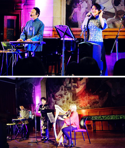 我校音乐学院申林副教授与谢晋影视艺术学院教师赵娴伉俪二人,近日受英国班戈大学音乐学院与孔子学院的邀请,与威尔士著名竖琴演奏家、歌唱家Gwenan Gibbard,北威尔士著名作曲家、班戈大学音乐学院教授Andrew Lewis共同举行了“双龙吟:威尔士与中国的音乐对话”专场音乐会,现场座无虚席。两国的音乐家们同台献艺了一场跨文化的传统音乐与现代电子音乐交相辉映的音乐盛宴,前来观摩演出的嘉宾有中国驻英国大使馆、伦敦大学孔子学院、爱丁堡大学苏格兰孔子学院等领导。此次演出被列入中国威尔士文化交流备忘录中。