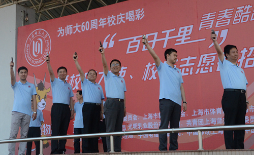 5月14日下午,上海师范大学“百日千里”青春酷跑邀请活动暨校园大使、校庆志愿者招募启动仪式在奉贤校区南操场举行,校党委书记陆建非、副校长丛玉豪、文汇报社党委书记陈振平、共青团上海市委员会副书记杨元飞来到了活动现场。