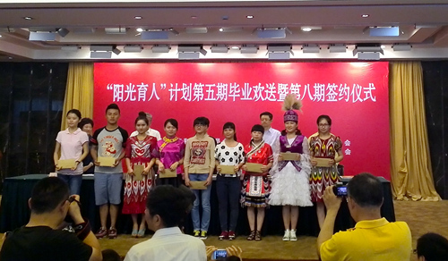 5月31日下午,“阳光育人”计划第五期毕业欢送暨第八期签约仪式在市政协举行。来自全市各高校藏、维、蒙、壮、回等18名少数民族大学生与导师结对签约。市政协副主席方惠萍出席并讲话。我校法政学院壮族学生覃柏芸作为第八期受助学生参加了签约仪式。