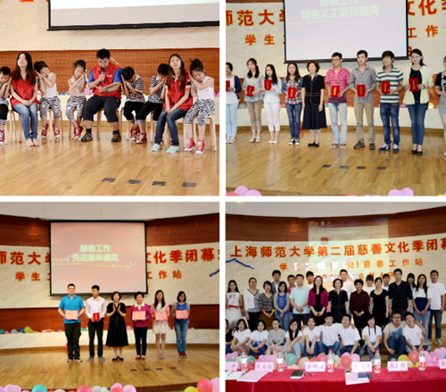闭幕式上回顾了本届慈善文化季中开展的一系列精彩纷呈的主题活动,慈善工作站以及各学院义工队进行了精彩的文艺表演,每个节目都紧紧围绕着慈善文化季主题,再现了众多义工校内外服务场景,现场高潮迭起。闭幕式上还对优秀个人和集体项目进行了表彰和颁奖。其中,人文与传播学院、商学院、生命与环境科学学院、谢晋影视艺术学院、信息与机电工程学院等5个学院获得“2013-2014学年上海师范大学慈善工作优秀集体”称号;人文与传播学院的“成长阅读活动”等10个项目获得“2013-2014学年上海师范大学慈善工作特色义工项目”的荣誉称号;谢晋影视艺术学院赵春祎、苏秦宇的“七彩小屋•影像人生”关爱农民工子弟爱心夏令营活动获得慈善公益项目策划大赛一等奖;人文与传播学院李红美、张婷的“沐禾行动”慈善公益项目以及信机学院倪灵斓、商学院叶曼、旅游学院吴义凤联合策划的自行车爱心接力项目分别获得二、三等奖;“资助情▪感恩心▪话成长”主题征文活动中,来自马克思主义学院的练书敏获得一等奖,法政学院聂佳慧、外国语学院竺小芳、旅游学院舒惠等3人获得二等奖,法政学院潘杰、徐小文、人文与传播学院胡冰鑫、数理学院夏征雄、信息与机电工程学院徐鹏等5人获得三等奖。