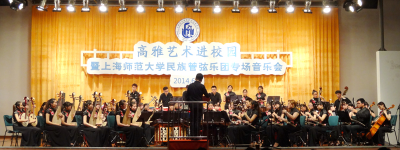 我校青年民族管弦乐团成立至今已将近十年。十年间,乐团在摸索中不断地成长与发展,从一只籍籍无名的小乐团,发展至拥有60余名成员的民族管弦乐团,在此过程中承载着乐团专业指导教师和学生的辛勤努力和付出。乐团不仅肩负着传承与弘扬中国传统民族音乐文化的重任,而且也在不断地寻求创新与发展,建设具有上海师范大学特色的高校青年民族管弦乐团。我校青年民族管弦乐团也将以“高雅艺术进校园”活动为契机传播传统民族文化,使更多非艺术专业的学生有机会接触到高雅艺术,陶冶情操,提高他们的审美情趣、艺术文化修养,营造健康向上的校园文化环境。