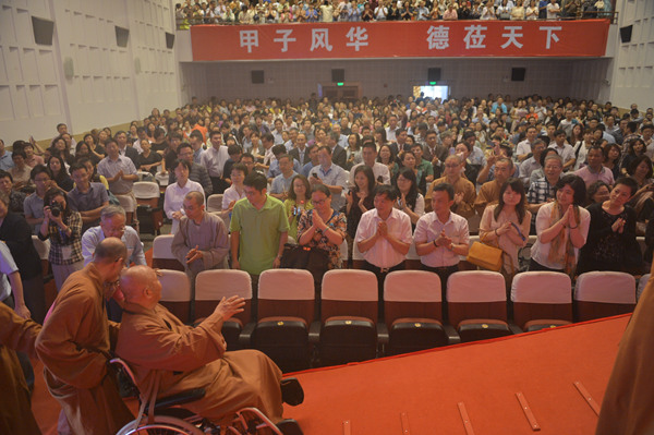 星云大师以浅显睿智的语言诠释了佛学深刻丰富的哲理,话语亲切平和,表情慈祥淡定,多次赢得听众们的热烈掌声和会心微笑。报告会过程中,星云大师还就听众提出的青年人如何在现实社会中奋斗前行、人类与自然怎样保持和谐共存等问题一一解答点拨。
