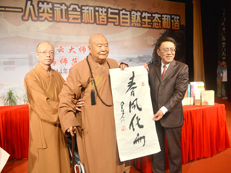 报告会上,星云大师接受了上海师范大学名誉教授的聘书,并亲笔题写了其独特的一笔字书法作品“春风化雨”赠送我校,以此表达大师对我校的厚爱和对人民教师的点赞。在随后进行的“四大的意义——人类社会和谐与自然生态和谐”学术报告会上,星云大师用通俗易懂的语言,深入浅出地向听众讲述了佛教中“四大”和“五蕴”皆空的道理。他指出,一般人认为“空”、“有”是两种截然不同的概念,实际上佛教所讲的“空”并非如此,是与“有”一体两面的,空是建设的有。只有真正的“空”,才能真正的“有”,即所谓“真空妙有”。空是不变的,能包容一切。同时,空又是变化的,不计较的。他用“四大皆空示现有,五蕴和合亦非真”这样一幅对联总结了他对“空”和“有”的深刻体悟。最后,他提出了“自心和悦、家庭和顺、人我和敬、社会和谐、世界和平”的理念,并逐一作了具体的阐释。他认为个人要从“自心和悦”做起,努力改造自己,唯有自己的内心柔和、慈悲、博爱之后,方可推动“家庭和顺”,家庭和顺以后,进入“人我和敬”之境界,人我之间和睦相亲、尊重包容,这样社会就和谐了,然后才能进一步倡导“世界和平”。