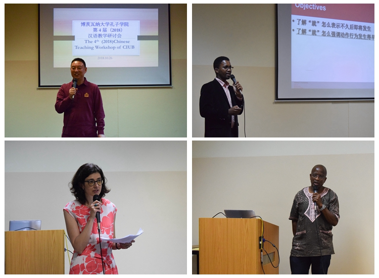 博大孔院王旭东老师在浅谈词汇学习的重要性之后,就如何高效、有趣地进行词汇教学,提高学生学习词汇的兴趣和效率进行了展示,借助图片和视频让学生了解词汇的起源和演变过程,并通过词卡游戏、歌曲和PPT教学等方式进行巩固记忆。曾奇老师从宏观上分享了汉语学习的策略,强调了科技手段的运用,让同学们感到耳目一新。张会杰老师从自身体验茨瓦纳文化的经历出发,探讨了中国传统文化学习对于汉语学习的重要性和积极作用。人文学院中文系讲师马奕男(Gracious T. Masule)以对比的方式生动幽默地讲解了“就”和“才”的用法,给出了汉语教学的实用技巧,还向大家讲述了他在中国学习汉语时的经历,鼓励大家不要怕出错,要多说多练。