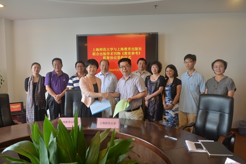 9月16日上午,上海师范大学与上海教育出版社就联合出版学术刊物《教育参考》签署框架协议。副校长刘晓敏率学报期刊杂志社社长何云峰、跨学科研究中心主任王正平、基础教育发展中心主任施斌等,与上海世纪集团报刊处主任吴申、上海教育出版社社长贾立群、副社长王耀东,以及双方负责项目的相关人员等参加了签约仪式。