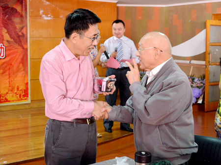 校领导还向1954年建校时的元老们送上学校特制的两枚60周年纪念徽章,老校长朱鸿鹗、顾翔为学校60周年校庆送上深深的祝福。