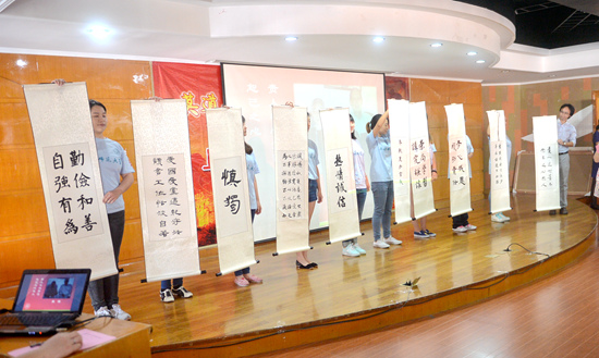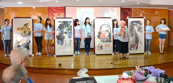 美术学院学生日前特地挥毫泼墨,将凝聚着老同志们精神和道德财富的家训现场赠送给老同志,祝愿老同志们家庭幸福美满。
