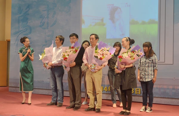 师范生代表向2014年度教育部“全国优秀教师”、“全国高校优秀思想政治理论课教师”周中之、上海市“教书育人楷模”孙雅艳、上海市第二届“上海高校后勤标兵”(绿叶奖)袁敏捷、我校11位“上海市育才奖”获得者的代表胡小猛献花致敬。
