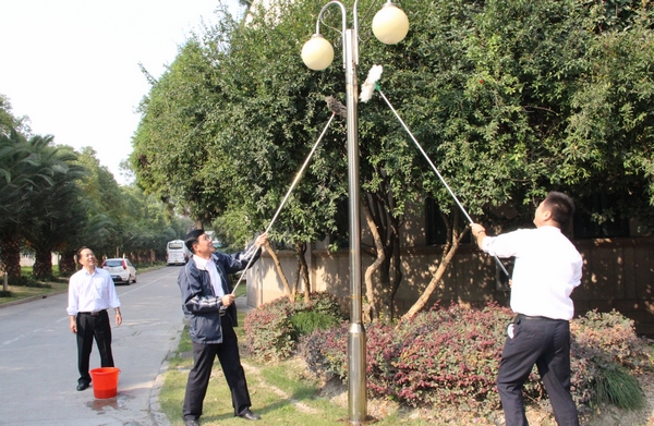活动中,后勤党员以支部为工作小组,带上水桶、抹布、方凳、梯子,你提水,我扶梯子,他擦灯柱,大家密切配合,一条条道路,一根根灯柱,一个个路牌,所到之处,灰尘、纸屑、铁丝等垃圾污垢全部被清理掉。两个多小时的清理活动,大家不怕脏不怕累,争先恐后抢活干,大汗淋漓不停歇。劳动结束后,总支书记钱成还亲任检查组长,对党员的清理活动进行了检查,肯定了大家的劳动成果。后勤人发扬了“拉得出靠得住”的保障精神,在学校60华诞来临之际,确保了校园环境整洁美丽。