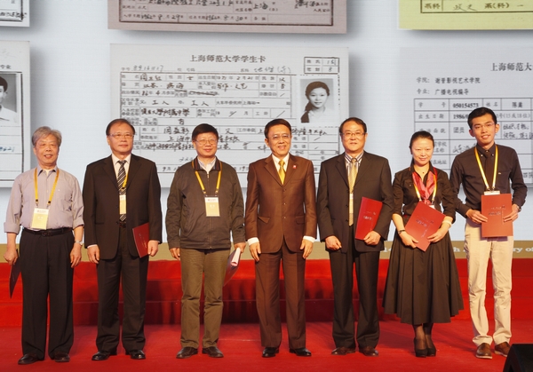 分别毕业于上世纪和刚走出校门不久的六位校友代表:著名作家俞天白、中国科学院院士褚君浩、中央党校原副校长李君如、七宝中学校长仇忠海、上海春秋国际旅行社(集团)有限公司董事周卫红、盛视天橙传媒有限公司创始人兼CEO陈嵩走上主席台为师大60华诞送上真情祝福,感恩母校的悉心培养,祝愿师大再创辉煌。校党委书记陆建非向他们分别赠送了珍贵档案——当年各自在师大求学时的学籍卡。
