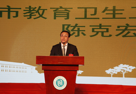 中共上海市教育卫生工作委员会书记陈克宏代表市教卫工作党委、市教委,对上海师大建校60周年表示热烈的祝贺,向为师大的建设和发展作出贡献的老教师、老同志,以及社会各界人士致以崇高的敬意!陈克宏高度评价上海师大60年来围绕发展大局,坚持走内涵发展道路,不断推进高水平综合性大学建设,在人才培养、科学研究、国际交流、社会服务等方面取得了令人瞩目的成绩,为上海经济社会和教育事业的发展作出了重要贡献。