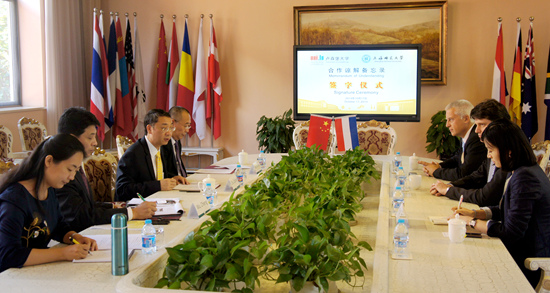 Leprévost首先向我校六十周年校庆表示祝贺,并借用我校校训“厚德、博学、求是、笃行”对两校的共同价值追求表示认可。他还详细介绍了卢森堡大学的情况,特别是国际化办学的特色,对两校在未来开展更深层次的合作表示期待。