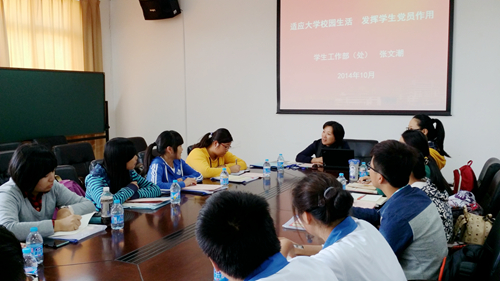 10月15日,校学生工作部(处)部(处)长张文潮应邀作了《适应大学校园生活,发挥学生党员作用》的报告。在报告中,她介绍了我校学生的基本情况,尤其是毕业生就业情况,并重点介绍了我校学生党员发挥作用的途径与平台,即围绕学校“造就卓越教师,培养都市新人”的人才培养目标,充分发挥党建引领的作用,重点搭好四大平台:基础文明的展示平台、优良学风的专业平台、志愿服务的社会平台、服务学生的关爱平台。她希望新生党员坚持树立远大理想、时刻牢记党的宗旨、不断树好党员形象。