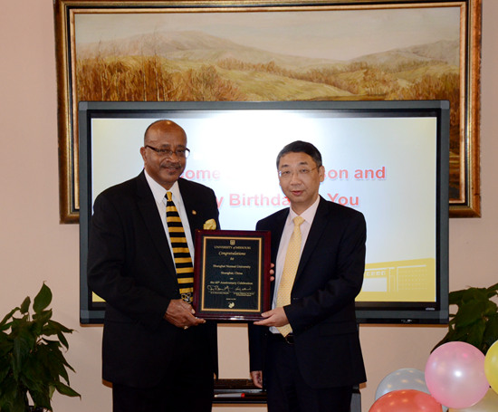 同日,校长朱自强亲切会见了密苏里大学副校长Williamson 和密苏里大学孔子学院外方院长欧阳文一行。会谈中,朱自强充分肯定了密苏里大学与上海师范大学之前的合作成果,希望两校在未来能够进一步开拓合作的领域,深化合作的内容,使两校关系更上一层楼。Williamson代表密苏里大学向我校赠送了“庆祝上海师大成立60周年”铭牌。