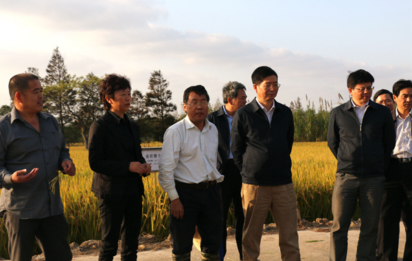 10月27日下午, 崇明县县长马乐声、副县长冯志勇、县农委主任袁刚,县农技推广中心主任沈寅寅等一行十余人来上海师范大学崇明水稻育种基地考察。我校生命与环境科学学院水稻遗传育种专家董彦君教授(前排左三)与基地相关人员陪同马乐声县长(前排左五)一行视察了校崇明水稻育种基地,了解今年优质和特色功能水稻新品种(系)生产种植示范以及特色功能稻米新产品研发的情况。