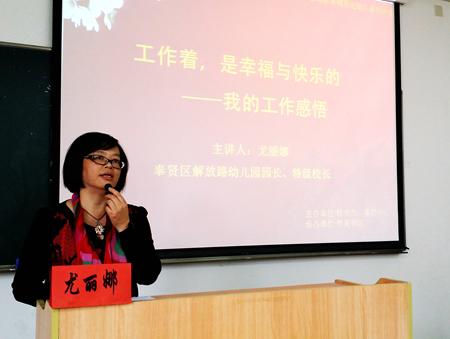 尤丽娜“工作着,是幸福与快乐的——我的工作感悟”的报告,以快乐、奉献、感恩、坚持、创新这五个主题词,深情并茂地讲述了她自己从教、支教、管理的经历、艰辛、压力,以及从中获得的幸福感受。她那快乐源于职业的认同、工作的动力、家庭的支持;奉献是三十多年的坚守、团队发展的生长点;感恩催生成长、滋润心田;坚持是事业起步的基石、永不放弃的源泉等富有情感、思想、内涵、哲理的话语,感染者现场每一位学前教育专业的学生。
