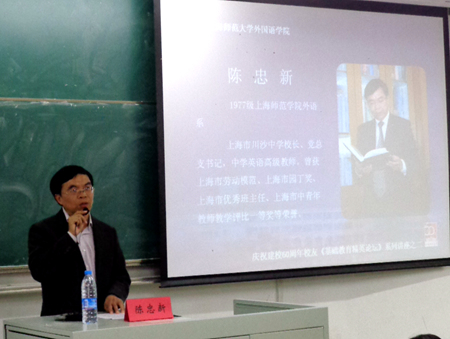 陈忠新在“坚守教育理念,做最好的自己”的报告中,以自己求学、入职、成才、管理的亲身经历、体验和感悟,满怀深情地讲述了如何学会坚守、如何学做老师,怎样在教师岗位上投入、敬业、奉献。他对英语专业的大学生提出了殷切的希望:珍惜大学时光,做好准备;增长各种才干,学好专业。