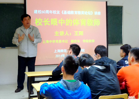 王辉从中学管理者的角度,作了题为“校长眼中的体育老师”的精彩演讲,也是一次现在的体育老师与未来的体育老师的专业对话。他围绕着关注体育学科的发展、把握学习贯通的本领、探索返璞归真的探索、8秒钟跑研究的概况等四个方面,从学校与社会、体育与健身、传统与创新、兴趣与评价、教学与研究等多个角度,对体育学科、体育老师、体育教育等进行了详尽的阐述,并对未来的体育老师提出了早作准备、不断积淀、经常思考、搞好研究的建议。