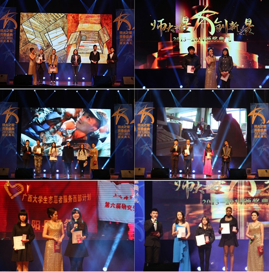 面对失败,他们不会放弃坚持;面对挫折,他们不曾停止思索,他们便是师大校园中的“创新之星”。来自生命与环境科学学院,曾荣获第十三届挑战杯大学生课外学术科技作品大赛全国三等奖的乔洁琼同学从漫画中获得了发明抑菌饮水器的灵感,用自己所收获的荣誉向大家证明了“一切创新归根结底都来源于生活”。此外,颁奖典礼上还展示了形式新颖的水墨动画片《三岔口》,谢晋影视艺术学院的团队负责人杨明骁同学希望能够弘扬国粹,使人们重拾对传统戏曲的热爱。在2014“创青春”全国大学生创业计划竞赛中获得金奖的上海贝尔农业科技有限公司代表赵雪舟,现在虽然远在甘肃玉门支教,但他通过视频的形式与颁奖典礼现场进行互动,向大家讲述了这一年半以来的艰辛与收获,希望能有更多学子成为主角走上人生的大舞台。
