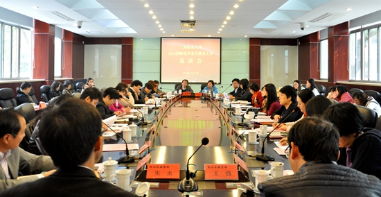 11月12日,学校在外宾楼101会议室举办2015届毕业生就业恳谈会。上海市教育人才中心副主任朱红梅、本市17个区县教育局的人事工作负责人,校学生处、研工部、教务处负责人,各学院学生工作副书记、毕业班辅导员参加会议。会议由校党委副书记葛卫华主持。